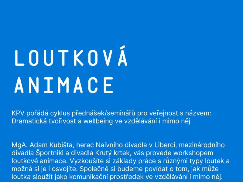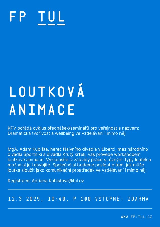 - Loutková animace, workshop (12. 3. 2025 v 10:40, budova P, učebna P100) – MgA. Adam Kubišta vás naučí základy práce s různými typy loutek a společně si budeme povídat o tom, jak může loutka sloužit jako komunikační prostředek ve vzdělávání i mimo něj.
