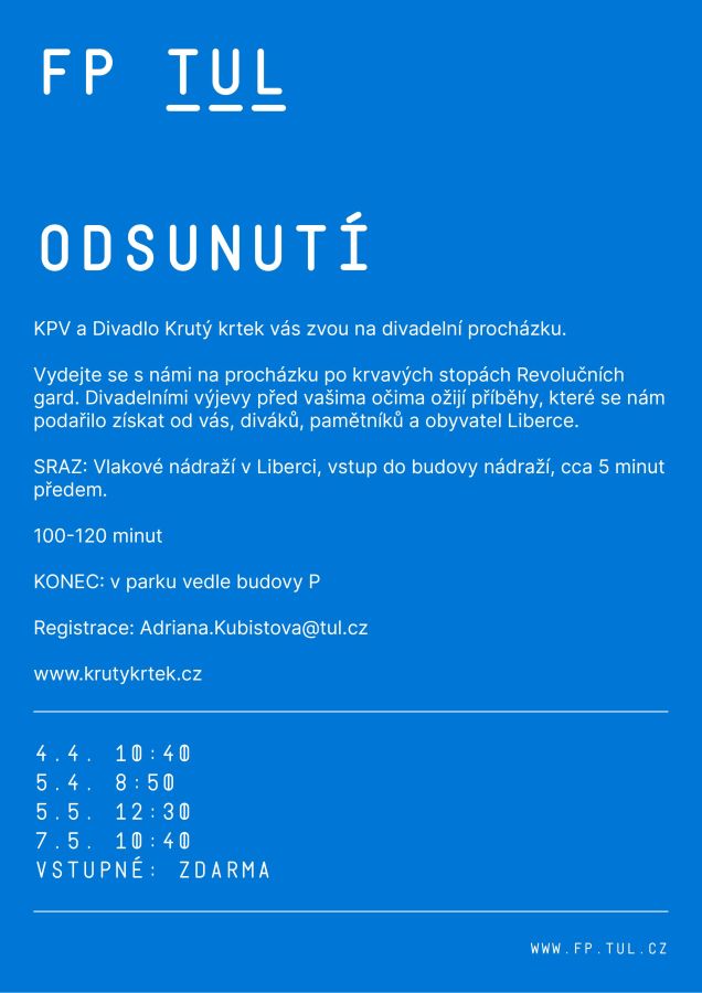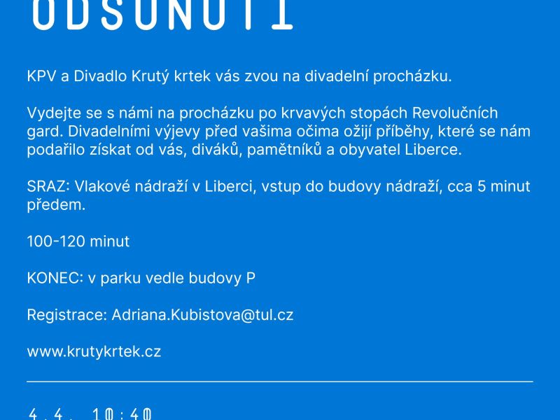 - Odsunutí, divadelní procházky (4. a 5. 4., 5. a 7. 5.) – vydejte se s námi na procházku po krvavých stopách Revolučních gard. Divadelními výjevy před vašima očima ožijí příběhy, které se nám podařilo získat od diváků, pamětníků a obyvatel Liberce.