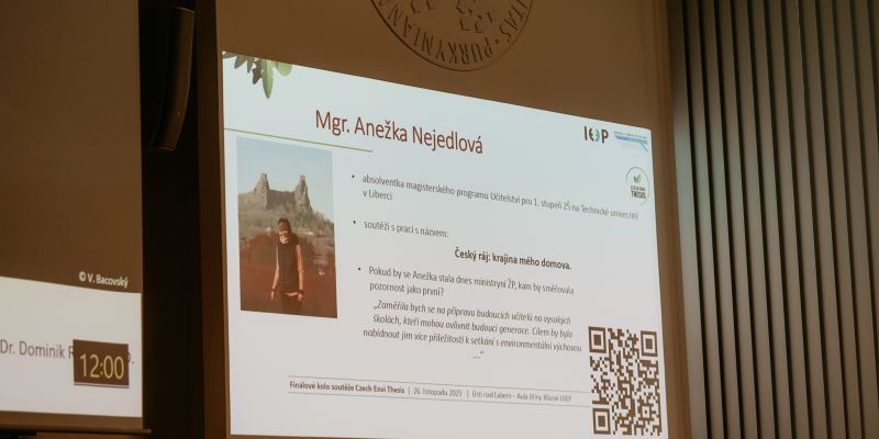 V celostátní soutěži bakalářských a diplomových prací v oblasti životního prostředí – Czech Envi Thesis - zvítězila absolventka KPV mgr. Anežka Nejedlová se svou diplomovou prací Český ráj: krajina mého domova (práci vedl vyučující KPV RNDr. Dominik Rubáš, Ph.D.). Finále soutěže, do které bylo přihlášeno 54 prací z českých univerzit, se konalo ve středu 26. 11. 2025 v prostorách Univerzity J. E. Purkyně v Ústí nad Labem. Anežka se stala celkovou vítězkou. Gratulujeme! Více o naší absolventce Anežce a o její práci v podcastu: https://open.spotify.com/episode/2KhJNhXyY3XfvWSklCC2JX