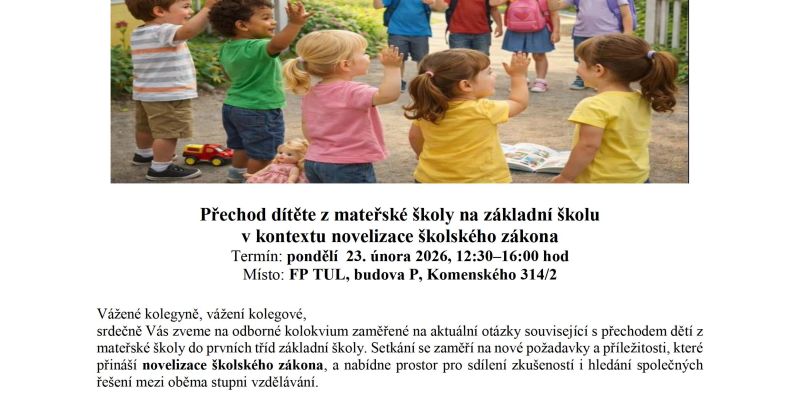 Katedra primární a preprimární pedagogiky FP TUL a katedra pedagogiky a psychologie FP TUL pořádají kolokvium PŘECHOD DĚTÍ Z MŠ DO ZŠ v kontextu novelizace školského zákona, které se uskuteční v pondělí 23. února 2026 v čase 12:30–16:00 hod na budově P a je určeno pro studující oboru Učitelství pro MŠ, Učitelství pro 1. stupeň ZŠ a pro provázející učitele fakultních MŠ a ZŠ. Tématem odborného setkání jsou AKTUÁLNÍ OTÁZKY SOUVISEJÍCÍ S PŘECHODEM DĚTÍ Z MATEŘSKÉ ŠKOLY DO PRVNÍCH TŘÍD ZÁKLADNÍ ŠKOLY. Setkání se zaměří na nové požadavky a příležitosti, které přináší novelizace školského zákona, a nabídne prostor pro sdílení zkušeností i hledání společných řešení mezi oběma stupni vzdělávání. Úvodní příspěvek přednese zástupkyně Odboru rovného přístupu ke vzdělávání a podpory pracovníků v regionálním školství MŠMT. Následné tematické workshopy povedou vyučující KPP a KPV FP TUL. Program kolokvia zde.