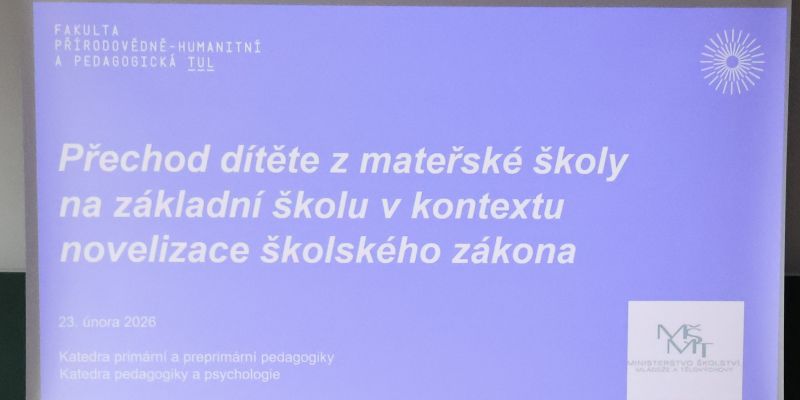 Katedra primární a preprimární pedagogiky FP TUL a katedra pedagogiky a psychologie FP TUL pořádaly kolokvium PŘECHOD DĚTÍ Z MŠ DO ZŠ v kontextu novelizace školského zákona, které se uskutečnilo v pondělí 23. února 2026 v čase 12:30–16:00 hod na budově P a bylo určeno pro studující oboru Učitelství pro MŠ, Učitelství pro 1. stupeň ZŠ a pro provázející učitele fakultních MŠ a ZŠ.