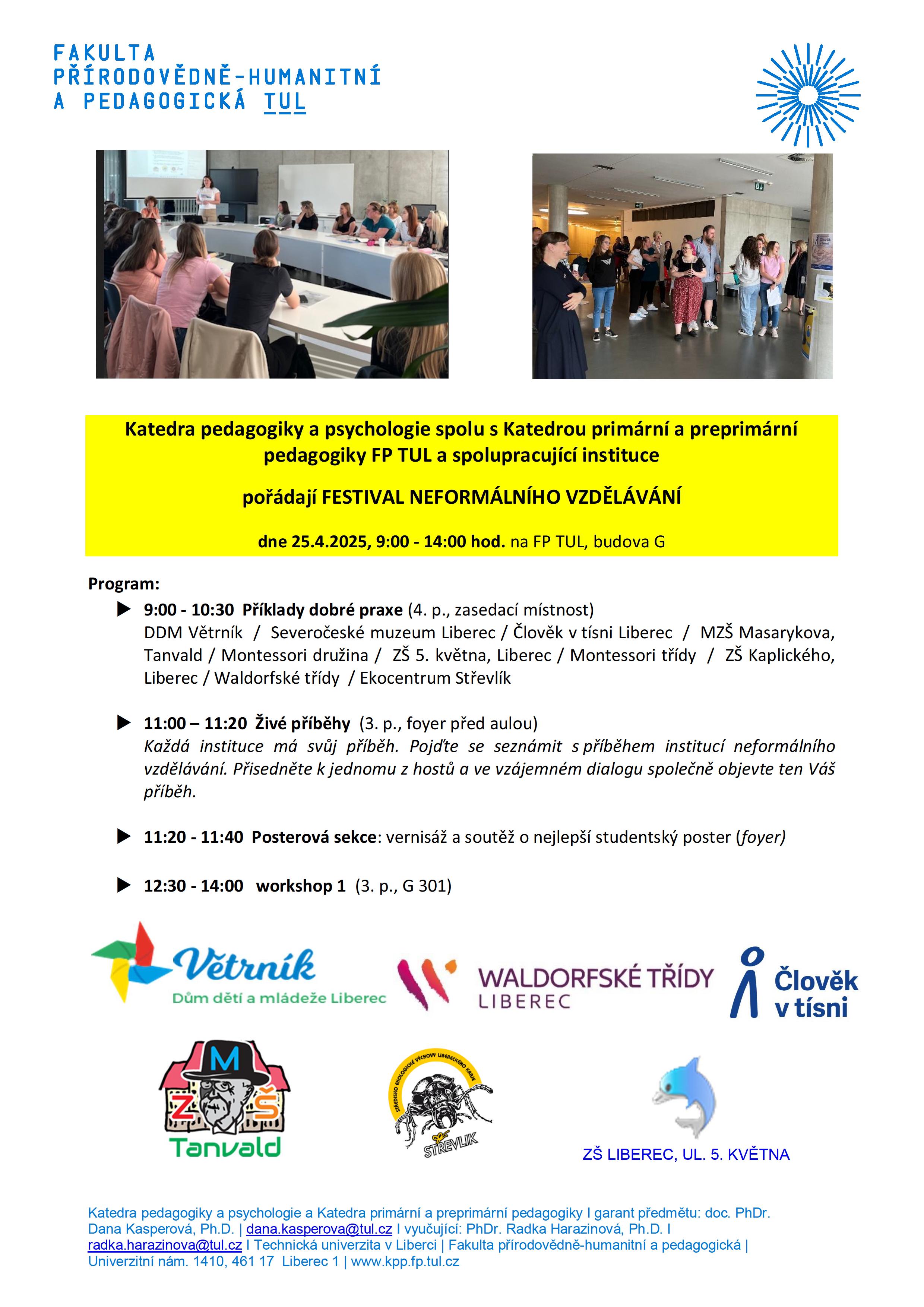 Dne 25. dubna 2025 se na Fakultě přírodovědně-humanitní a pedagogické TUL uskutečnil 4. ročník Festivalu neformálního vzdělávání, pořádaný Katedrou pedagogiky a psychologie ve spolupráci s Katedrou primární a preprimární pedagogiky. Festivalu se vedle studentů FP TUL zúčastnili zástupci významných neziskových a příspěvkových organizací libereckého regionu (Člověk v tísni, Ekocentrum Střevlik, Severočeské muzeum v Liberci, DDM Větrník) či vedoucí školních klubů inovativních škol (ZŠ Kaplického Waldorfské třídy, ZŠ 5. května Liberec Montessori, MZŠ Tanvlad). Hlavním tématem Festivalu bylo utváření Společenství praxe, které slouží jako platforma pro setkávání akademiků a studentů FP TUL se zástupci „dobré praxe“ v oblasti neformálního vzdělávání. Studenti měli možnost setkat se se zástupci zapojených institucí a získat detailní informace o jejich činnosti i možnostech spolupráce v rámci praxí. Program zahrnoval prezentace příkladů dobré praxe, živé příběhy, posterovou sekci se studentskou soutěží a tematický workshop.
