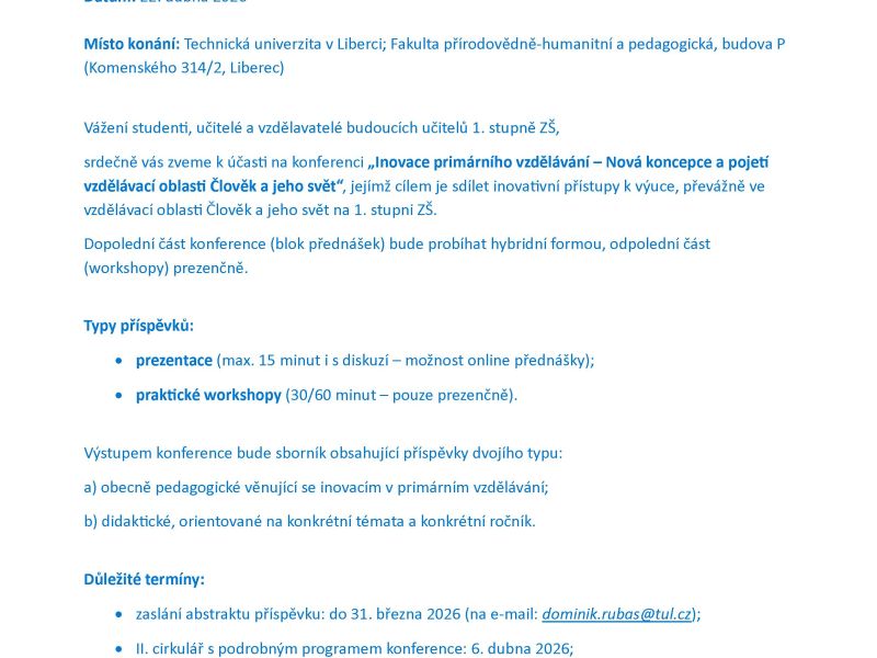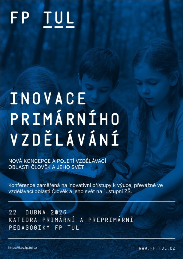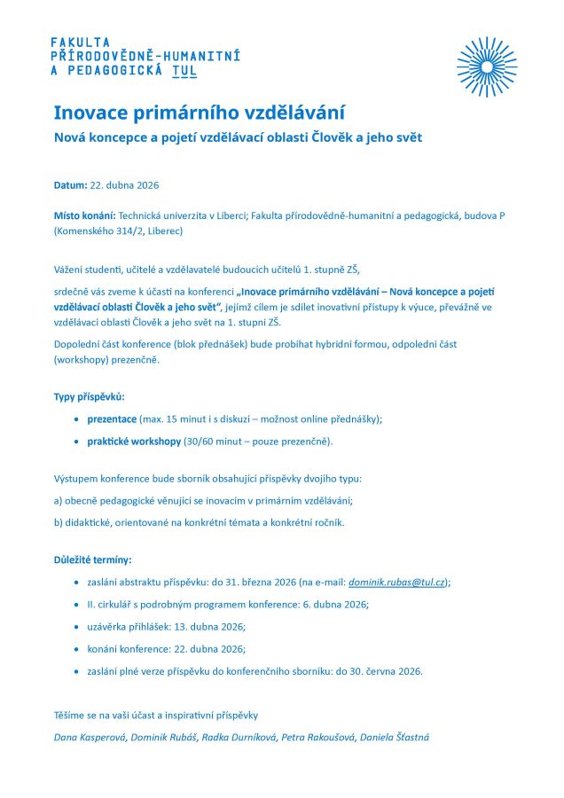 srdečně vás zveme k účasti na konferenci „Inovace primárního vzdělávání – Nová koncepce a pojetí vzdělávací oblasti Člověk a jeho svět“, jejímž cílem je sdílet inovativní přístupy k výuce, převážně ve vzdělávací oblasti Člověk a jeho svět na 1. stupni ZŠ.