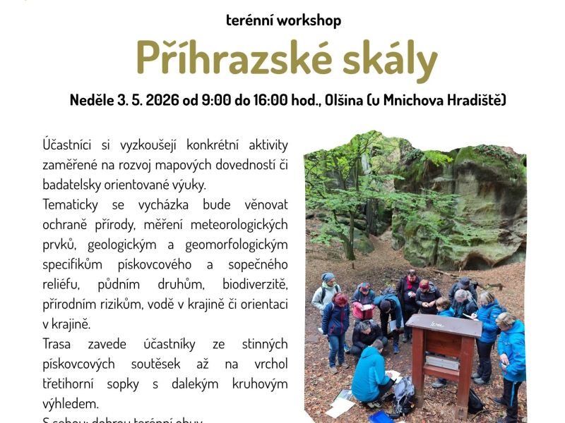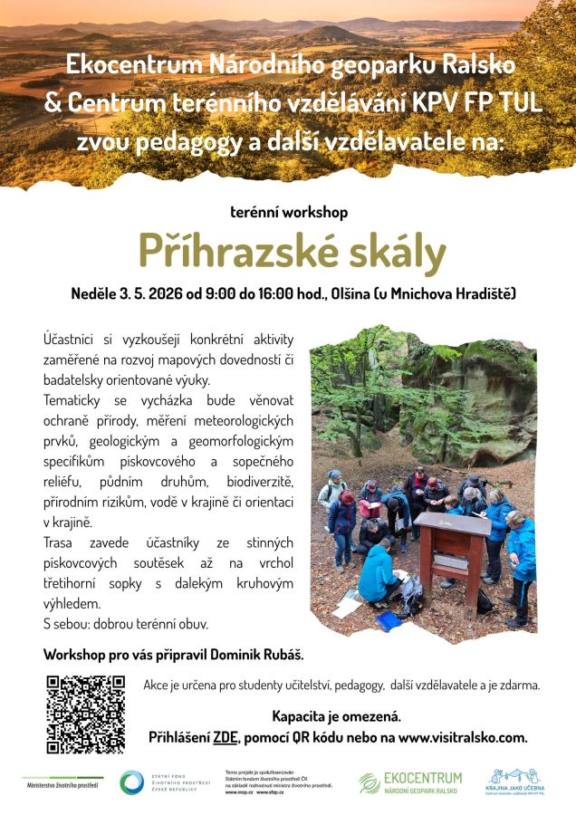 Centrum terénního vzdělávání KPV FP TUL společně s Ekoncentrem Národního geoparku Ralsko Vás zvou na terénní workshop do Příhrazských skal, a to v neděli 3. 5. 2026. Akce je určena pro studenty učitelství, pedagogiky a další vzdělavatele.