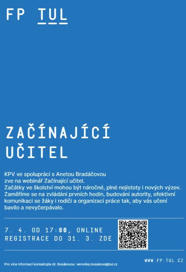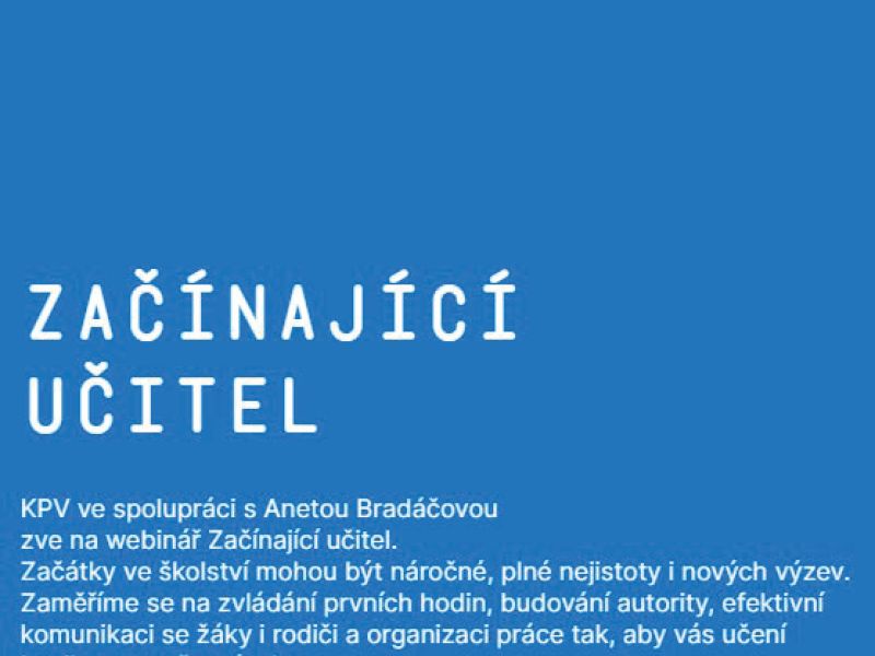 KPV ve spolupráci s Anetou Bradáčovou zve na webinář Začínající učitel, který se bude konat 7. 4. 2026 od 17:00h.